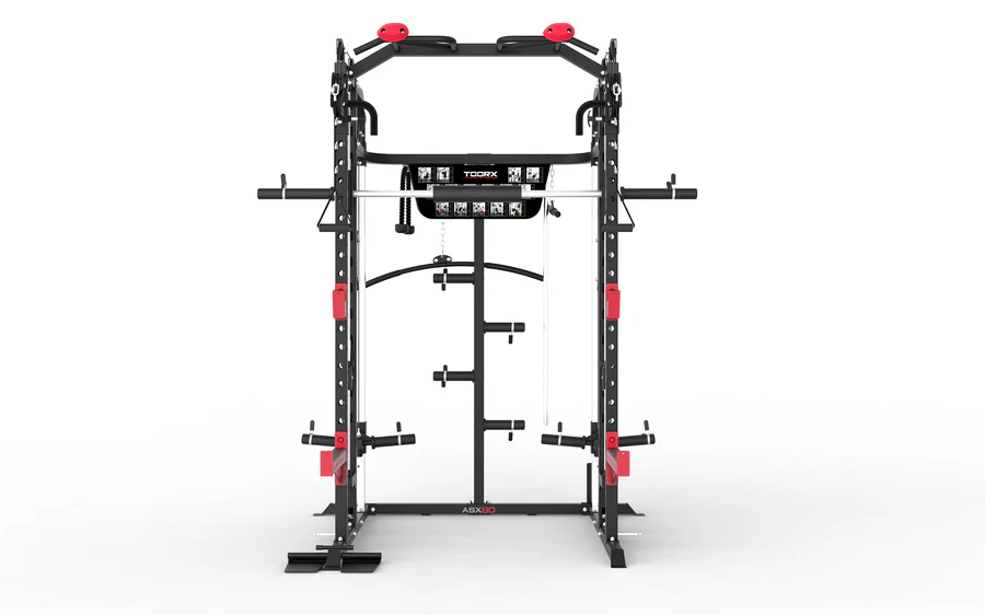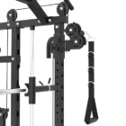 DOTAZIONE 3-IN-1 dual pulley&row, smith machine, rack. Sistema di carico dischi ø50 mm e ø25 mm. 1 Squat bar, 2 J-hooks, coppia fermi di sicurezza bilanciere, barbell storage, barra trazioni multipresa, 4 ganci per fasce elastiche, 8 porta dischi ø50 mm e ø25 mm, 12 ferma dischi a molla ø49 mm e 4 ø25 mm.Attachments: cavigliera, corda doppia tricipiti, catena, landmine, 2 maniglie trazioni, barra lat e barra corta dritta incluse